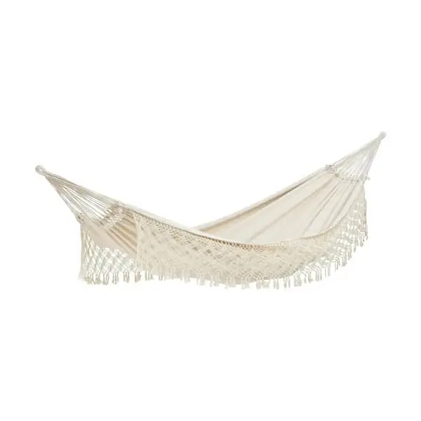 Rio Hængekøje er en brasiliansk hængekøje i moderne boheme-stil – perfekt til afslapning ude såvel som inde. Den er et traditionelt og bæredygtigt håndværksprodukt fremstillet med en Jacquard-væveteknologi. Den og de og talrige ophængssnore giver en følelse af vægtløshed, ligesom det håndvævede bomuldsbånd, der arbejdes ind i ophængssnorene, kompenserer for høje punktbelastninger og sørger for, at hængekøjen folder sig ud.