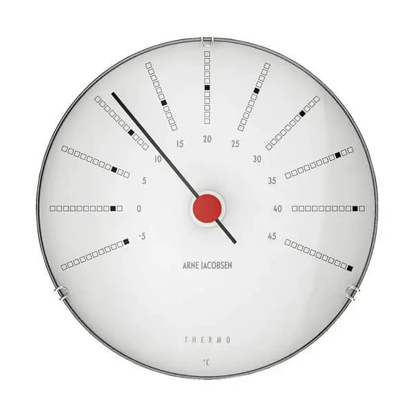Arne Jacobsens kendte Bankers ur er inspirationen bag Arne Jacobsen Bankers termometer. Det minimalistiske og funktionalistiske design er et kendetegn for Arne Jacobsen. Med Bankers vægur, hygrometer, barometer og termometer kan du skabe en komplet vejrstation, hvor du altid har helt styr på dine omgivelser. Diameter: 12 cm.