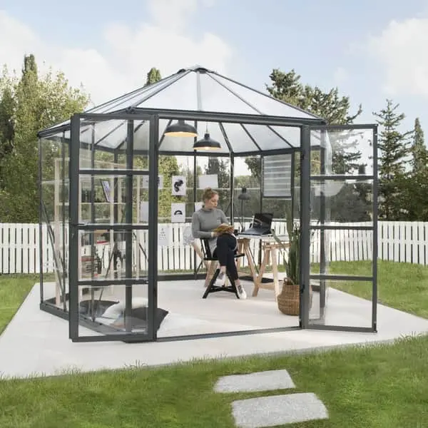 Dette sekskantede drivhus har et stilfuldt design med en holdbar, grå pulverlakeret aluminiumramme, og er konstrueret med forstærkede afstivere for ekstra stabilitet. Drivhuset har dobbeltlags polycarbonatplader på taget, som beskytter planterne mod stærk sollyseksponering, mens krystalklare polycarbonatpaneler på væggene giver over 90% lysoverførsel, blokerer skadelige UV-stråler og er brudsikre. Drivhuset har en bred dobbelthængt dør med låsbart dørhåndtag for ekstra beskyttelse og sikkerhed. Der er også et indbygget rensesystem til effektiv vanddræning og indsamling, samt et sidelamel vindue, som giver luftstrøm og tillader regulering af varme og fugtighedsniveauer. Drivhuset leveres med en galvaniseret stålsokkel for øget stabilitet, og har desuden en høj loftshøjde for en forbedret arbejdsstilling. Der er også et udvalg af tilbehør tilgængelige for at tilpasse dit drivhus til dit behov, herunder et skyggekit, robuste hylder, vindueåbningskit, planteholdere, opbindingskit og vandingskit.