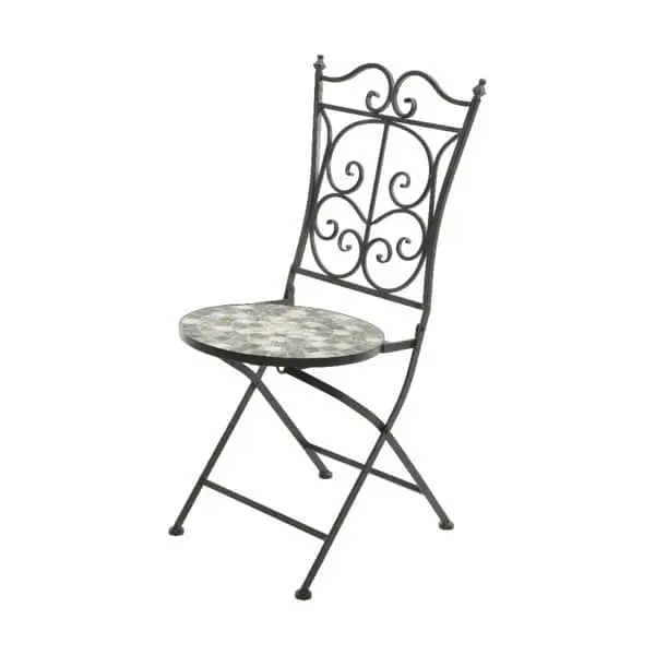 Den fine caféstol er beklædt med smukke mosaikfliser i farven terracotta, som skaber en indbydende sydlandsk stemning – uanset om det er i haven eller på altanen.