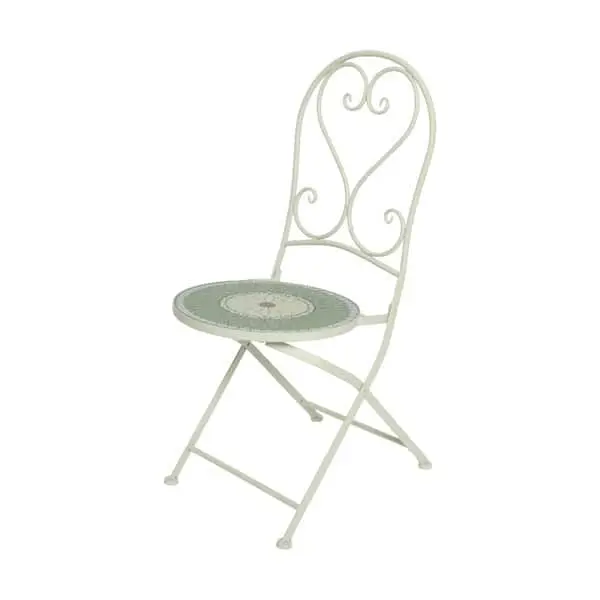 Caféstolen er beklædt med blomstrede mosaikfliser, og har fine krummelurer integreret i ryglænet, som giver et romantisk touch. Selve stellet er fremstillet i hårdført jern, hvilket gør det særdeles oplagt til din have eller altan.