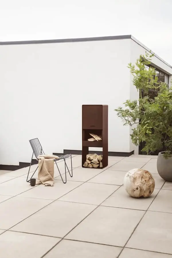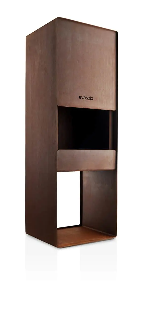 Havepejsen har et enkelt og stilrent design, der tager næsten ingen plads. Pejsen har en integreret brændeholder, der gør du altid kan have brændet lige ved hånden. Og en indbyggede skorsten der leder røgen ud bagest af pejsen, så du undgår de gener midt i hyggen.