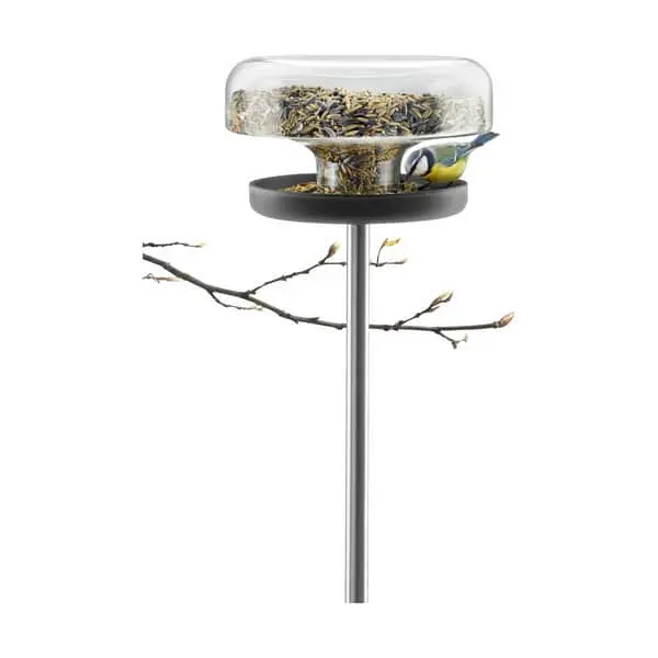Med Eva Solo fuglefoderbræt kan du glæde dig over at følge havens fugle hele året. Fuglefoderbrættet står på et spyd, der blot skal stikkes ned i jorden det ønskede sted, fx i nærheden af køkkenvinduet, så du kan glæde dig over synet af fuglene lige fra morgenstunden. Tip: Du kan tiltrække forskellige fugle, alt efter hvad du fodrer med. Drosler er glade for æbler, og du kan med fordel fodre med de stødte eller halvrådne, du ikke selv vil spise. Bogfinke, grønirisk, kvækerfinke og kernebider sætter stor pris på især solsikke og hampefrø, mens krager, duer og spurve foretrækker korn. Materiale: Frostsikkert glas og rustfrit stål. Foderbrættet kan indeholde op til 2 liter foder.