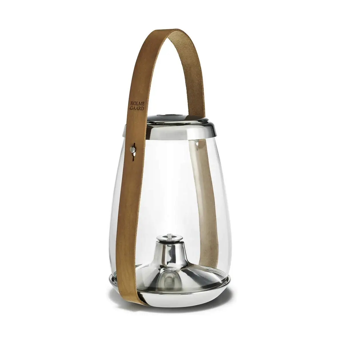 “Skab hygge året rundt med Design With Light olielanternen. Hæng lanternen op udenfor i træet, brug den på varme sommeraftener på terrassen eller stil den på trappen og giv dine gæster en smuk velkomst. Du kan også bruge den til at sprede hygge i entreen eller som dekoration i stuen. Lanternen er fremstillet i mundblæst Borosilikat glas, der er slagfast og varmeresistent samt stål, og har en smuk hank af kernelæder. Lanternes væge er fremstillet af kulfiber, og har en lang brændetid på ca. 5000 timer.