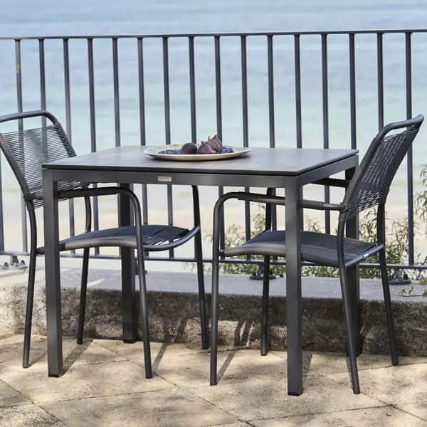 Elba havebord måler H 73 x B 65 x L 65 cm og fremstillet i højtrykskompaktlaminat (HPL) og aluminium, hvilket giver det et enkelt og klassisk udtryk, som kan bruges både i haven, altanen eller terrassen. Materialet gør bordpladen slidstærkt og ridsefast, der tåler vand, olie, frost og meget mere, så du slipper for den helt store vedligeholdelse af bordet.
