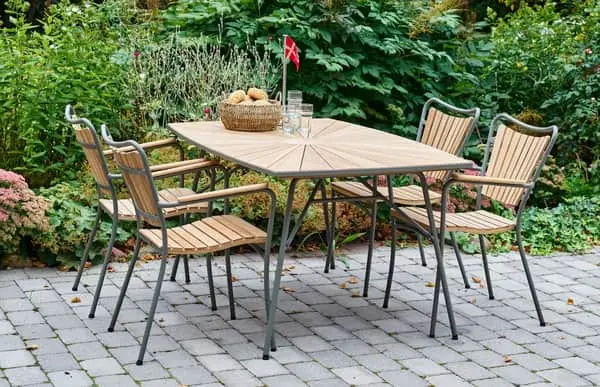 Indret dig på terrassen eller i haven med det kendte havemøbel-design Marguerit fra Mandalay. Sættet består af et Marguerit bord og 4 stole.