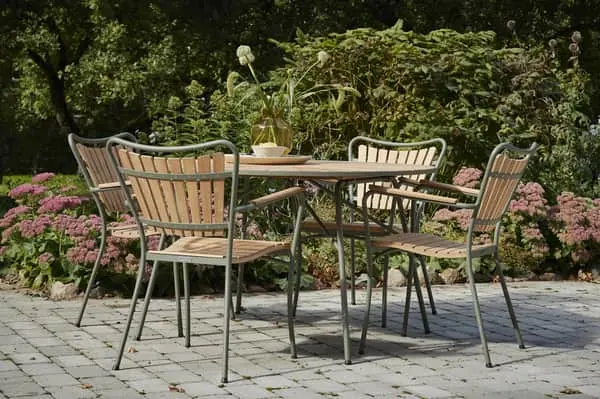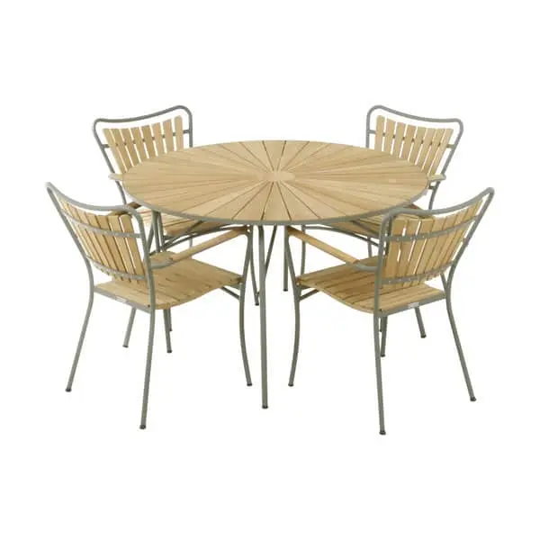 Indret dig på terrassen eller i haven med det kendte havemøbel-design Marguerit fra Mandalay. Sættet består af et Marguerit bord og 4 stole.