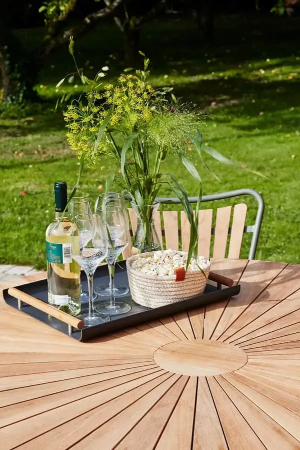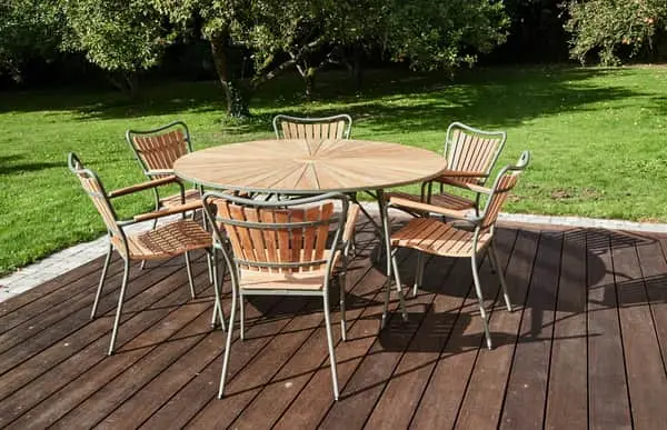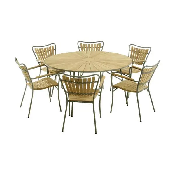 Indret dig på terrassen eller i haven med det kendte havemøbel-design Marguerit fra Mandalay. Sættet består af et Marguerit bord og 6 stole.