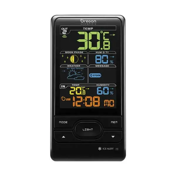 Med vejrstationen fra Oregon Scientific får du både vejrudsigt og den nuværende vejrsituation præsenteret i én vejrstation. På den let læselige LED-skærm kan du nemt aflæse indendørs og udendørs temperaturer fra tre forskellige lokationer, luftfugtighed, is alarm og månefase. Vejrstationen har radiokontrolleret urværk og er selvindstillende, når det kommer til sommer og vintertid
